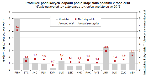 Graf 6. Produkce podnikových odpadů podle kraje sídla podniku v roce 2018