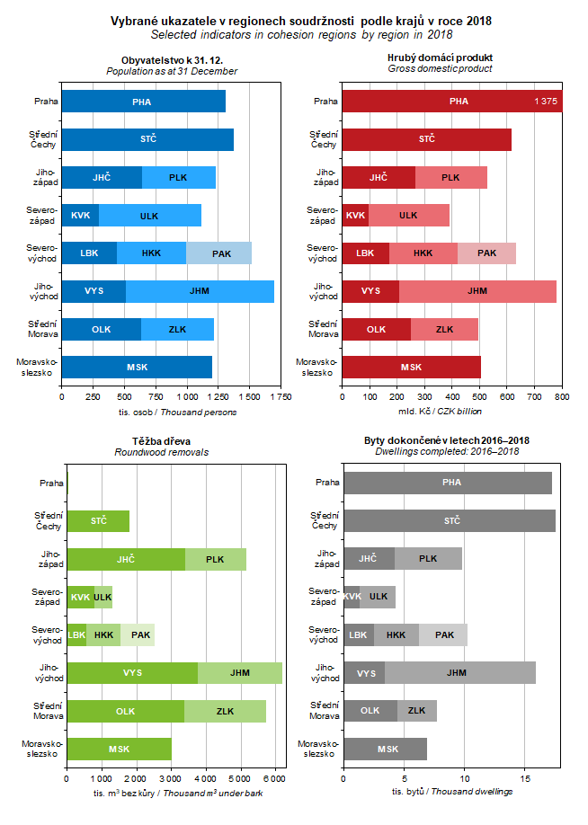 Graf 50. Vybrané ukazatele v regionech soudržnosti podle krajů v roce 2018