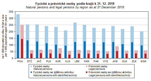Graf 22. Fyzické a právnické osoby podle krajů k 31. 12. 2018