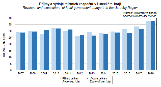 Graf 15. Příjmy a výdaje místních rozpočtů v Ústeckém kraji