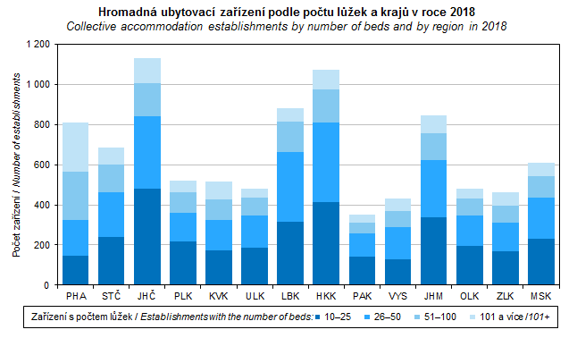 Graf 37. Hromadná ubytovací zařízení podle počtu lůžek a krajů v roce 2018