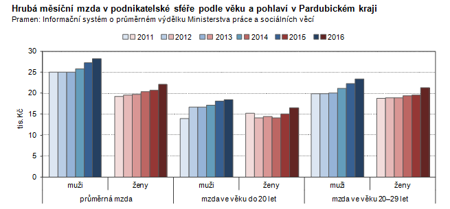 Hrubá měsíční mzda v podnikatelské sféře podle věku a pohlaví v Pardubickém kraji