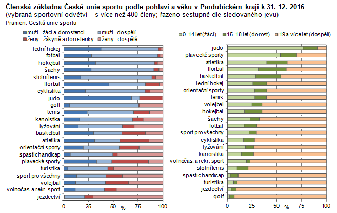 Členská základna České unie sportu podle pohlaví a věku v Pardubickém kraji k 31. 12. 2016