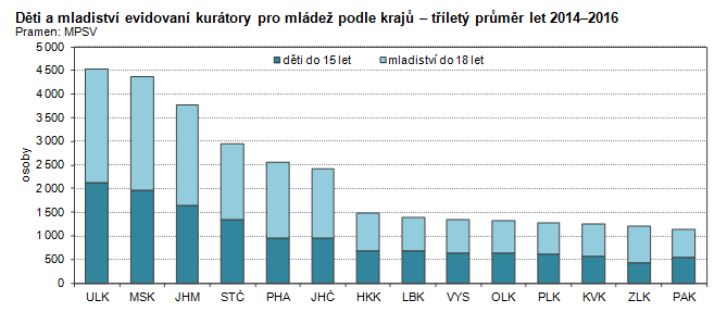 Děti a mladiství evidovaní kurátory pro mládež podle krajů – tříletý průměr let 2014–2016