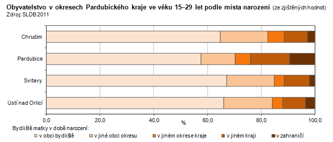 Obyvatelstvo v okresech Pardubického kraje ve věku 15–29 let podle místa narození