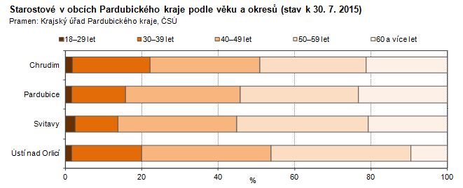 Starostové v obcích Pardubického kraje podle věku a okresů (stav k 30. 7. 2015)