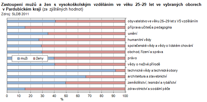 Zastoupení mužů a žen s vysokoškolským vzděláním ve věku 25–29 let ve vybraných oborech v Pardubickém kraji