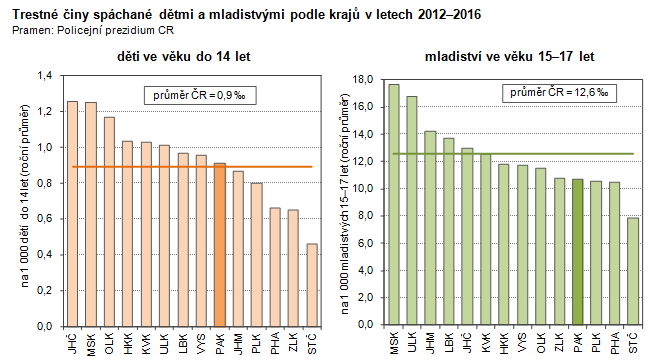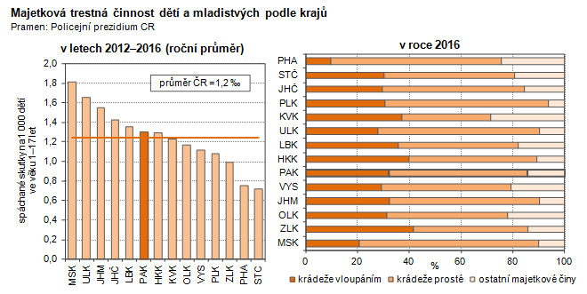 Trestné činy spáchané dětmi a mladistvými podle krajů v letech 2012–2016