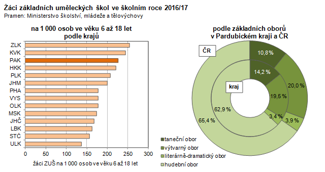 Žáci základních uměleckých škol podle pohlaví a základních oborů v Pardubickém kraji ve školním roce 2016/17
