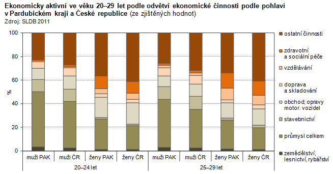 Ekonomicky aktivní ve věku 20–29 let podle odvětví ekonomické činnosti podle pohlaví v Pardubickém kraji a České republice