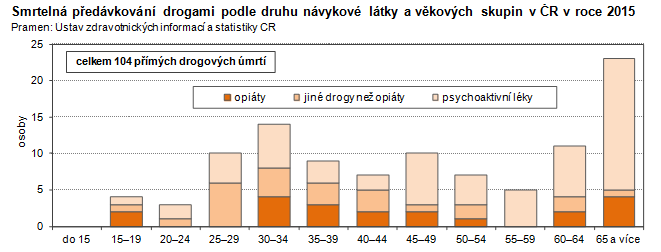 Smrtelná předávkování drogami podle druhu návykové látky a věkových skupin v České republice roce 2015