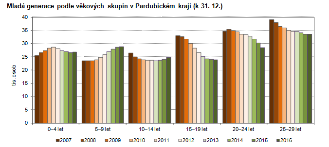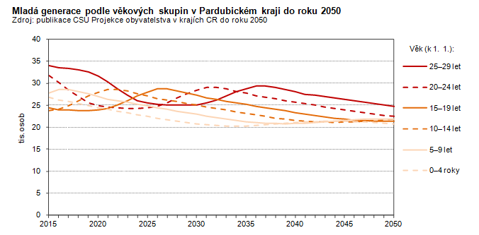 Mladá generace podle věkových skupin v Pardubickém kraji do roku 2050