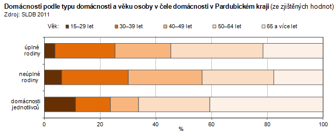 Domácnosti podle typu domácnosti a věku osoby v čele domácnosti v Pardubickém kraji