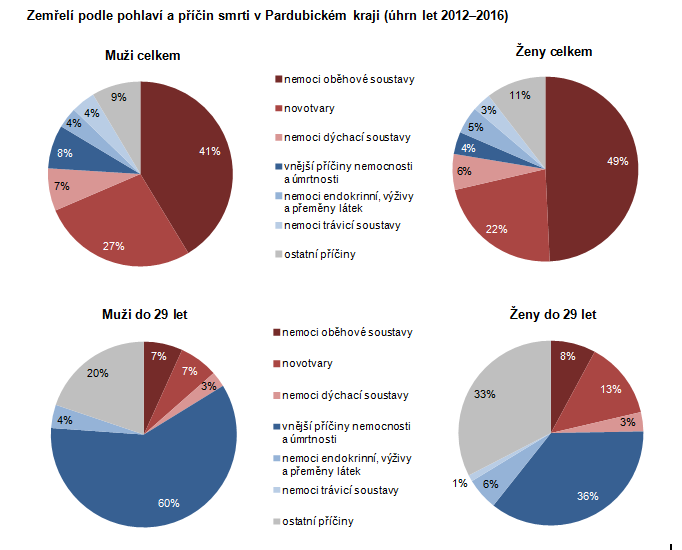 Zemřelí podle pohlaví a příčin smrti v Pardubickém kraji (úhrn let 2012–2016)