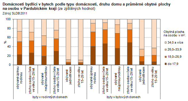 Domácnosti bydlící v bytech podle typu domácnosti, druhu domu a průměrné obytné plochy na osobu v Pardubickém kraji