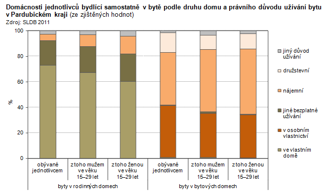 Domácnosti jednotlivců bydlící samostatně v bytě podle druhu domu a právního důvodu užívání bytu v Pardubickém kraji