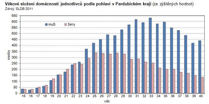 Věkové složení domácností jednotlivců podle pohlaví a rodinného stavu v Pardubickém kraji