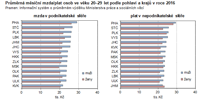 Průměrná měsíční mzda/plat osob ve věku 20–29 let podle pohlaví a krajů v roce 2016
