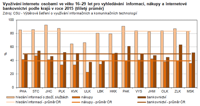 Využívání internetu osobami ve věku 16–29 let pro vyhledávání informací, nákupy a internetové bankovnictví podle krajů v roce 2015