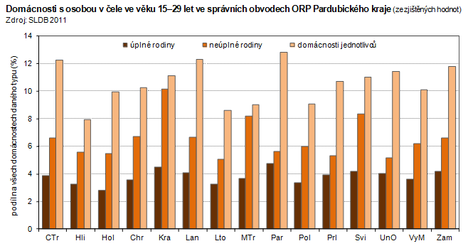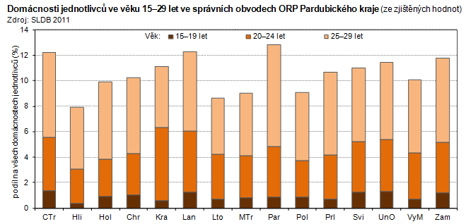 Domácnosti jednotlivců ve věku 15–29 let ve správních obvodech ORP Pardubického kraje