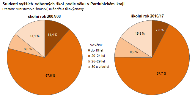 Studenti vyšších odborných škol podle věku v Pardubickém kraji