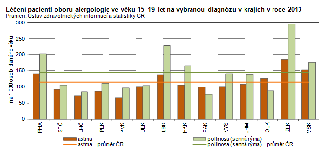 Léčení pacienti oboru alergologie ve věku 15–19 let na vybranou diagnózu podle krajů v roce 2013