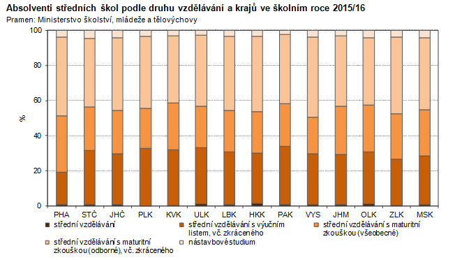 Absolventi středních škol podle druhu vzdělávání a krajů ve školním roce 2015/16