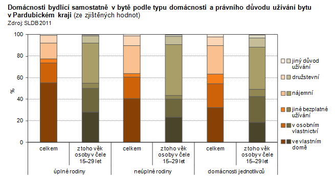Domácnosti bydlící samostatně v bytě podle typu domácnosti a právního důvodu užívání bytu v Pardubickém kraji
