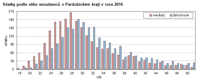 Sňatky podle věku snoubenců v Pardubickém kraji v roce 2016