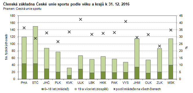 Členská základna České unie sportu podle věku a krajů k 31. 12. 2016