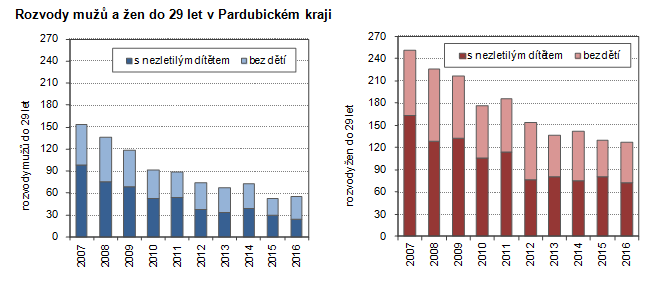 Rozvody mužů a žen do 29 let v Pardubickém kraji