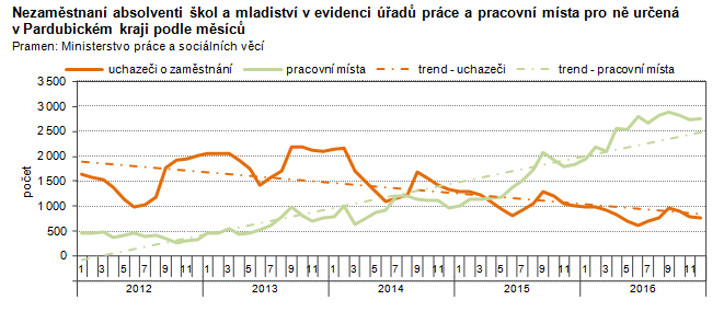 Nezaměstnaní absolventi škol a mladiství v evidenci úřadů práce a pracovní místa pro ně určená v Pardubickém kraji podle měsíců