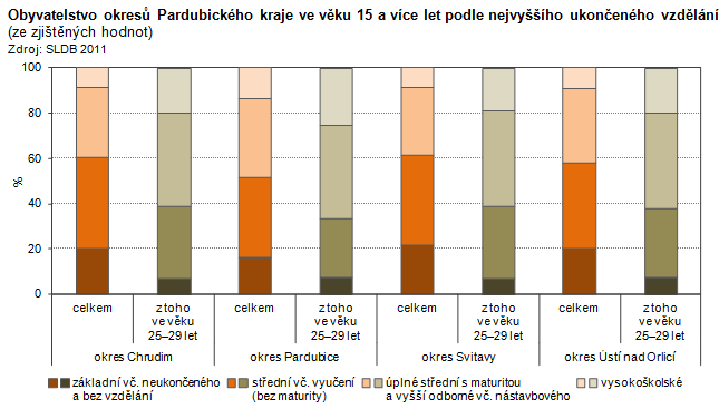 Obyvatelstvo v okresů Pardubického kraje ve věku 15 a více let podle nejvyššího ukončeného vzdělání