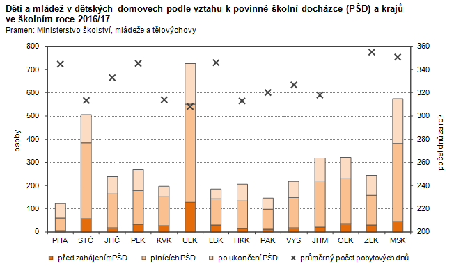 Děti a mládež v dětských domovech podle vztahu k povinné školní docházce (PŠD) a krajů ve školním roce 2016/17