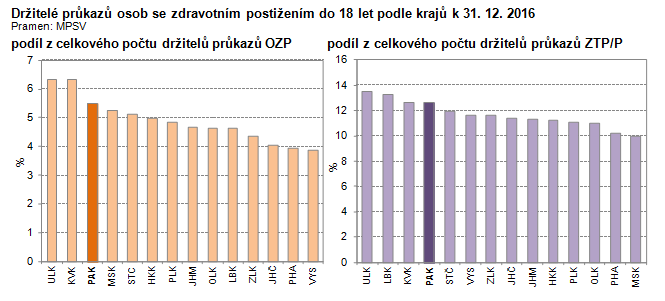 Držitelé průkazů osob se zdravotním postižením do 18 let podle krajů k 31. 12. 2016