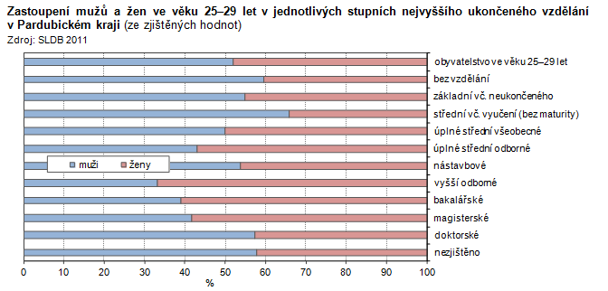 Zastoupení mužů a žen ve věku 25–29 let v jednotlivých stupních nejvyššího ukončeného vzdělání v Pardubickém kraji