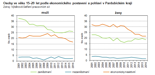 Osoby ve věku 15–29 let podle ekonomického postavení a pohlaví v Pardubickém kraji