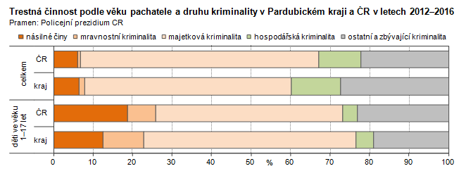 Trestná činnost podle věku pachatele a druhu kriminality v Pardubickém kraji a ČR v letech 2012–2016