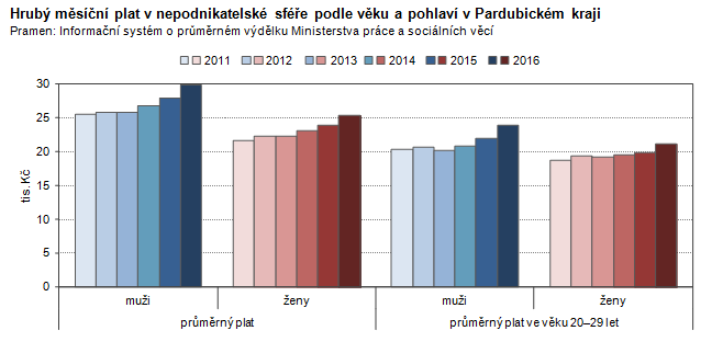 Hrubý měsíční plat v nepodnikatelské sféře podle věku a pohlaví v Pardubickém kraji