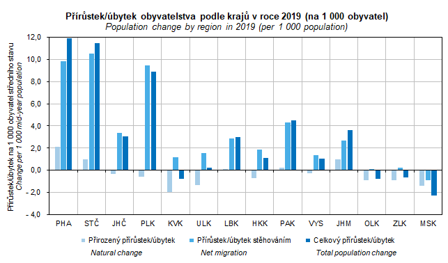 Graf 12. Přírůstek/úbytek obyvatelstva podle krajů v roce 2019 (na 1 000 obyvatel)