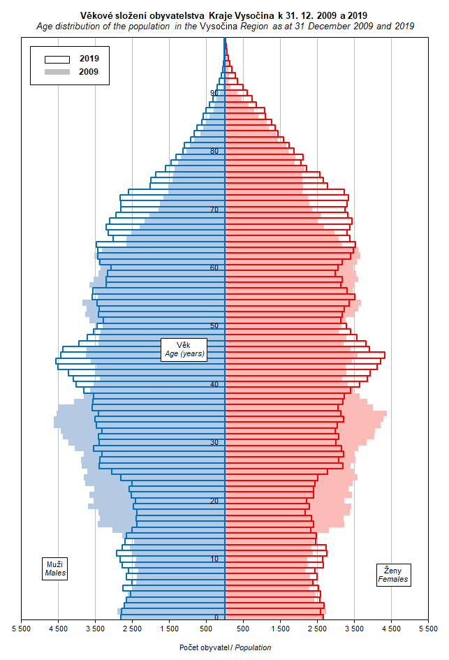 Graf 9. Věkové složení obyvatelstva Kraje Vysočina k 31. 12. 2009 a 2019