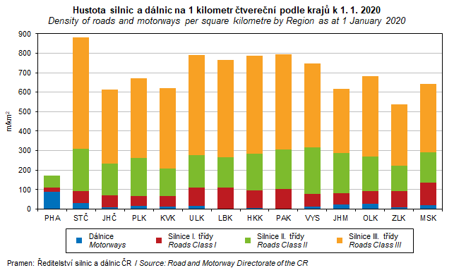 Graf 40. Hustota silnic a dálnic na 1 kilometr čtvereční podle krajů k 1. 1. 2020