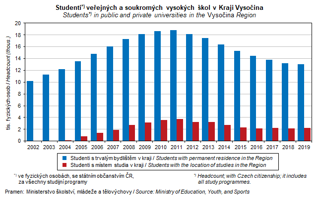Graf 42. Studenti veřejných a soukromých vysokých škol v Kraji Vysočina