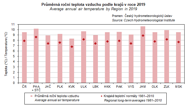 Graf 3. Průměrná roční teplota vzduchu podle krajů v roce 2019