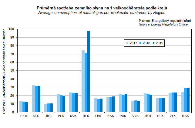Graf 34. Průměrná spotřeba zemního plynu na 1 velkoodběratele podle krajů
