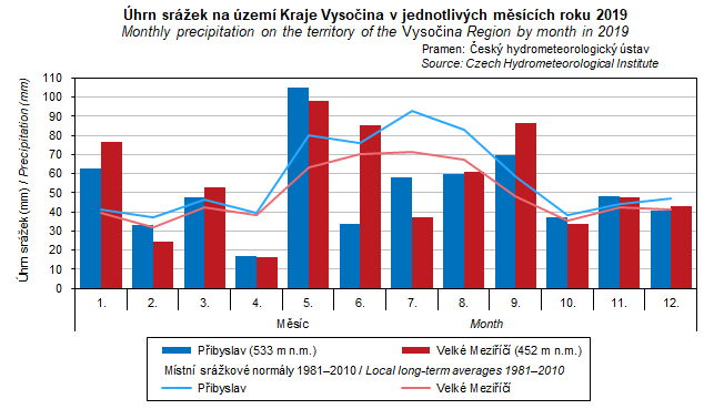 Graf 2. Úhrn srážek na území Kraje Vysočina v jednotlivých měsících roku 2019