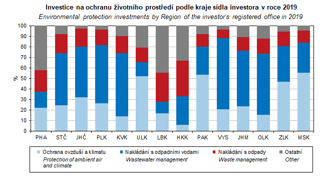 Graf 4. Investice na ochranu životního prostředí podle kraje sídla investora v roce 2019