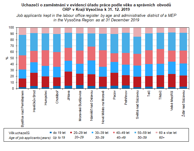 Graf 51. Uchazeči o zaměstnání v evidenci úřadu práce podle věku a správních obvodů ORP v Kraji Vysočina k 31. 12. 2019