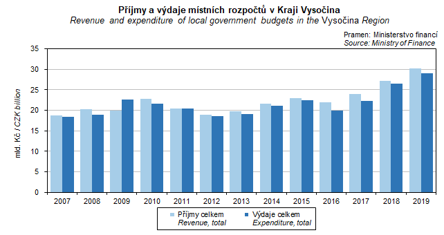 Graf 16. Příjmy a výdaje místních rozpočtů v Kraji Vysočina