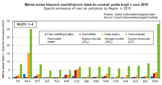 Graf 5. Měrné emise hlavních znečišťujících látek do ovzduší podle krajů v roce 2018